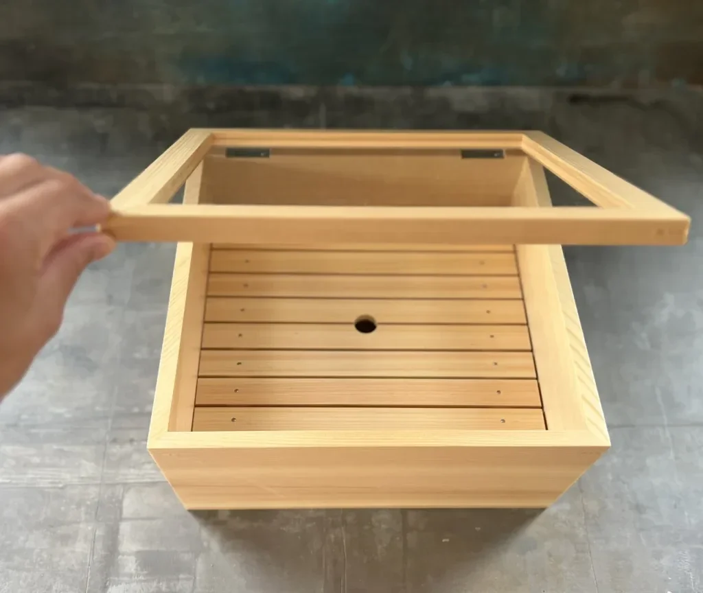 De box meet 30 × 29 × H17 cm (binnenhoogte 11,6 cm), waardoor hij geschikt is voor professioneel gebruik in sushi- en sashimikeukens. Het gladde oppervlak van het cipressenhout maakt schoonmaken eenvoudig en zorgt tegelijkertijd voor een hygiënische presentatie.